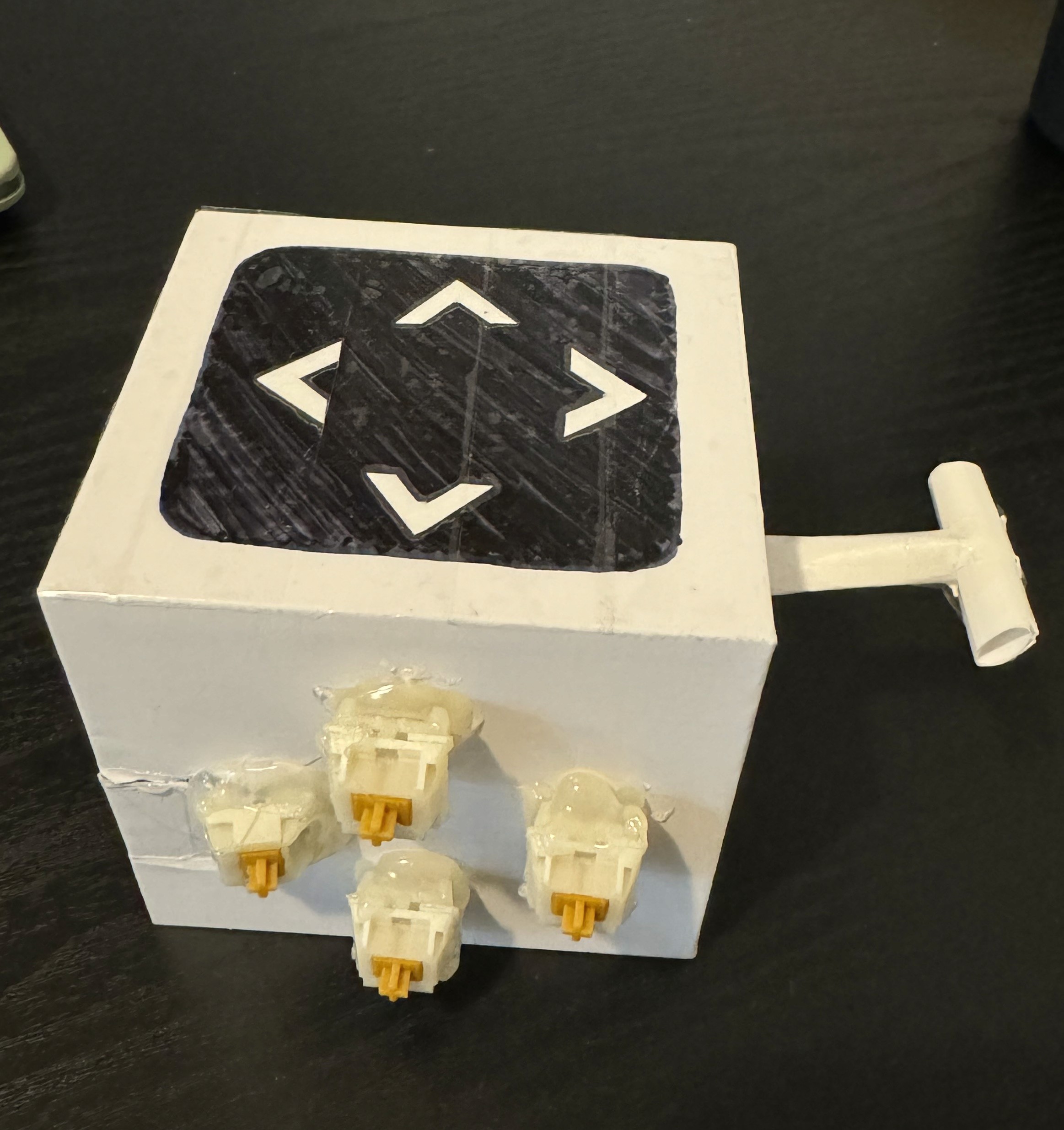To gain a better sense of what the final design might feel like and have some objective way to evaluate the design with our participants, I also created a physical prototype using paper, glue, tape, and some keyboard switches.